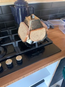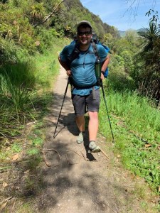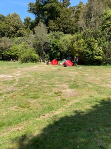 Große Campsite vor dem Timber Trail – Team Sweden in Schwarz und Kiwi-Dame in grün bei der Arbeit. Mein Zelt stand schon neben mir.
