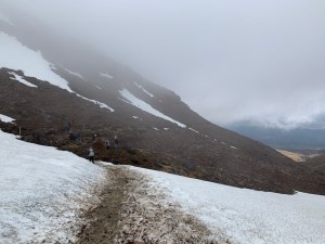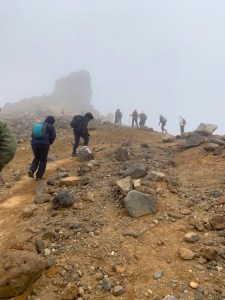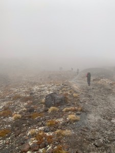 Immer nur kurz ging die Wolkenwand mal auf und man konnte kurz was erkennen. Man läuft am Kraterrand entlang, ohne die Kante oder den Boden zu sehen.