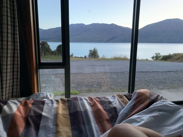 Luxuszimmer in der Lake Ohau Lodge. Aufwachen mit Blick auf den See.