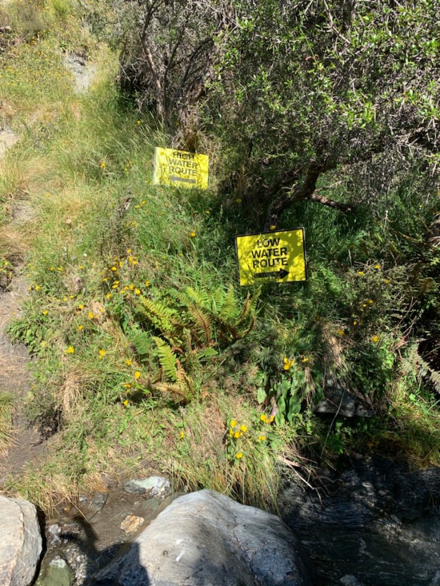 Hier hat man zwei Möglichkeiten. Die Hochwasser Route oder die Niedrig Wasser Route. Die Hochwasserroute ging direkt den Hang hoch. Es hat seit Tagen nicht geregnet und heute ist es brennend heiß. Ab durch den Bach