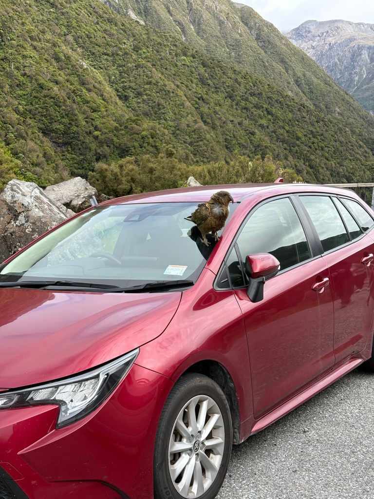 Oben am Arthur‘s Pass hat sich noch ein Kea erbarmt. Wenigstens hat er nicht mein Auto angetestet.