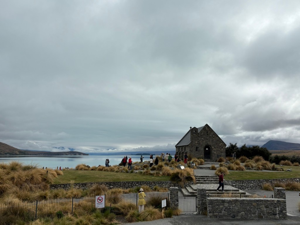 Man sieht schon, es ist zwar trocken, aber hinter dem Kirchlein sollte Mount Cook und die benachbarten 3000er zu sehen sein. War halt nicht.
