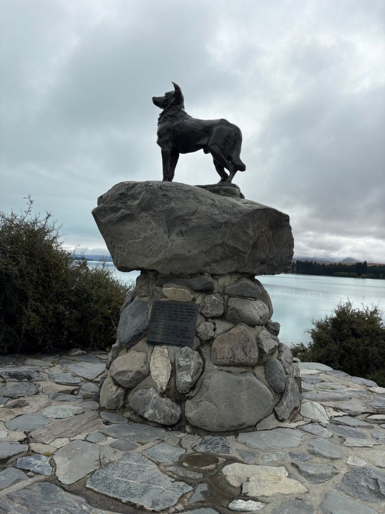 Ich hatte auf der anderen Ortsseite geparkt, ein kurzer Spaziergang durch Tekapo zur Church of the good Shepherd. Und zum Denkmal des Hütehundes.