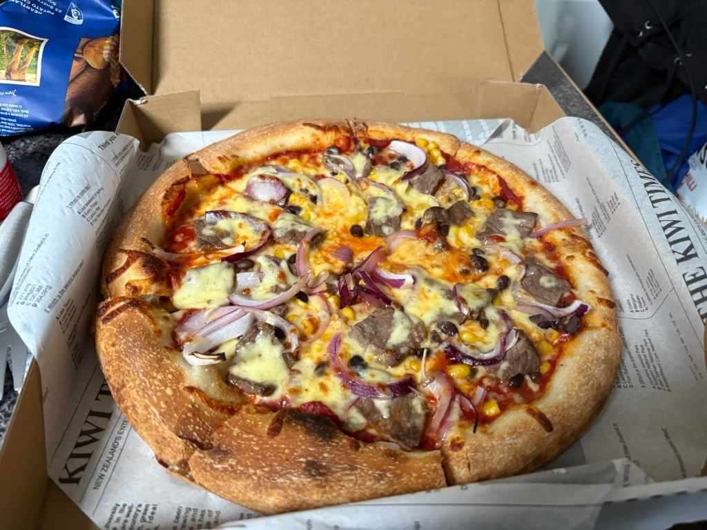Bin trotzdem zurück zum Campingplatz. Zum Kochen hatte ich keine Lust. Das Brot ist alle. Also Mitnehmpizza. Ganz oben im Ort. Eine Dame aus der Trailfamilie ist vorhin ohne auf mein Hallo zu reagieren an mir vorbei gerannt. Auch sie hatte Pizza. Und Regen. Irgendwo verständlich.