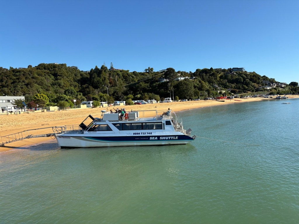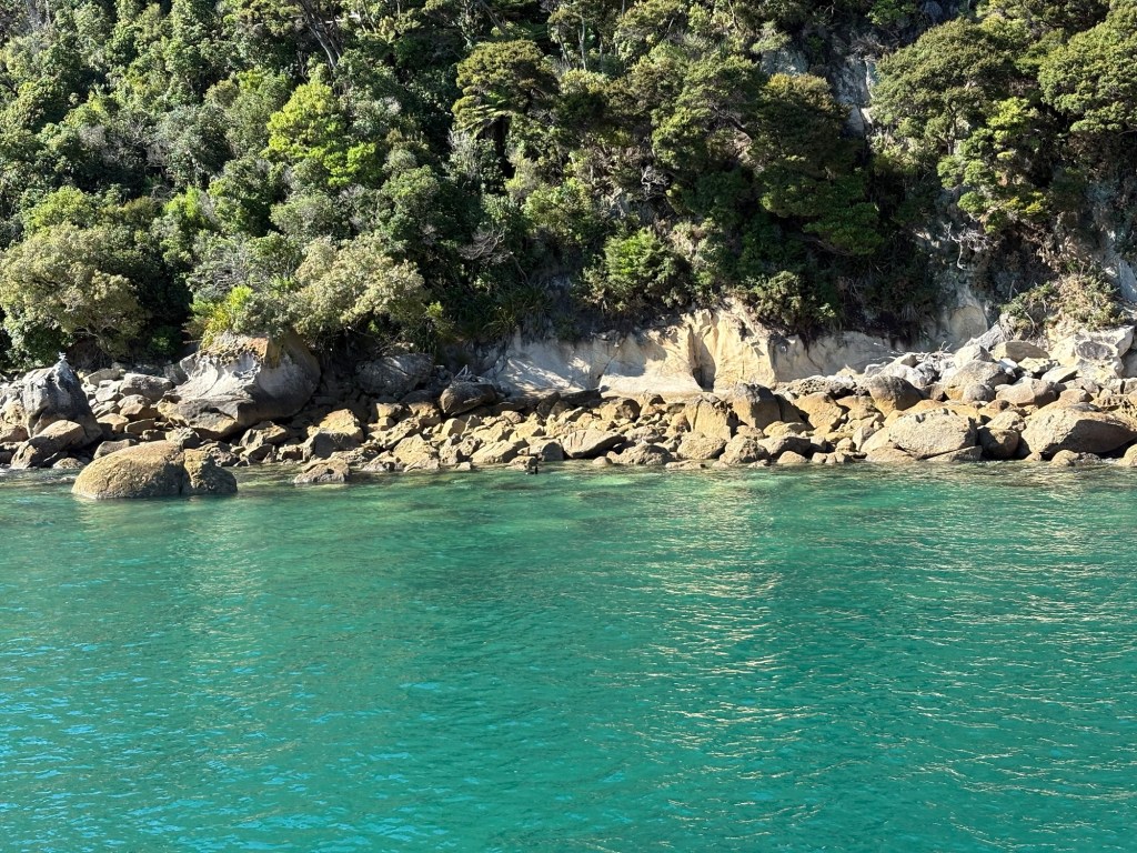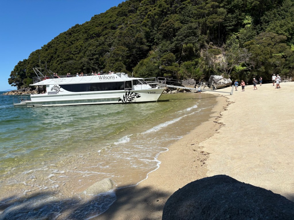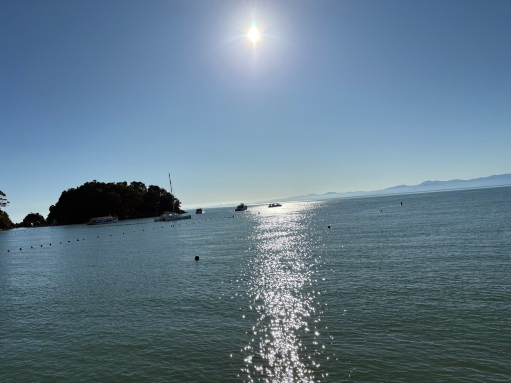 Noch 10min laut Schild zum Treffpunkt und über eine Stunde Zeit. Das große Boot kann einen hier einsammeln. Bin nach 5m im Meer bis zum Bauchnabel im Wasser gestanden. Und nach 100m immer noch. Der Strand ist schön flach. Die Sonne brennt. Baden. Passt.