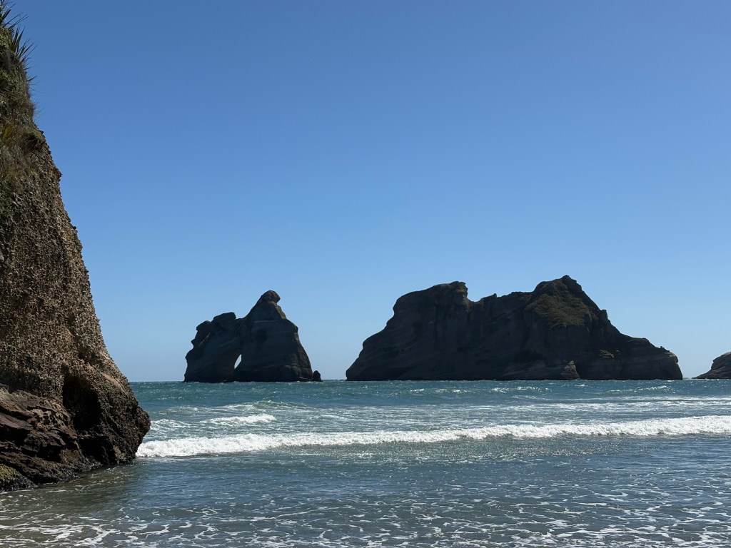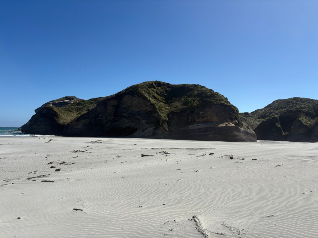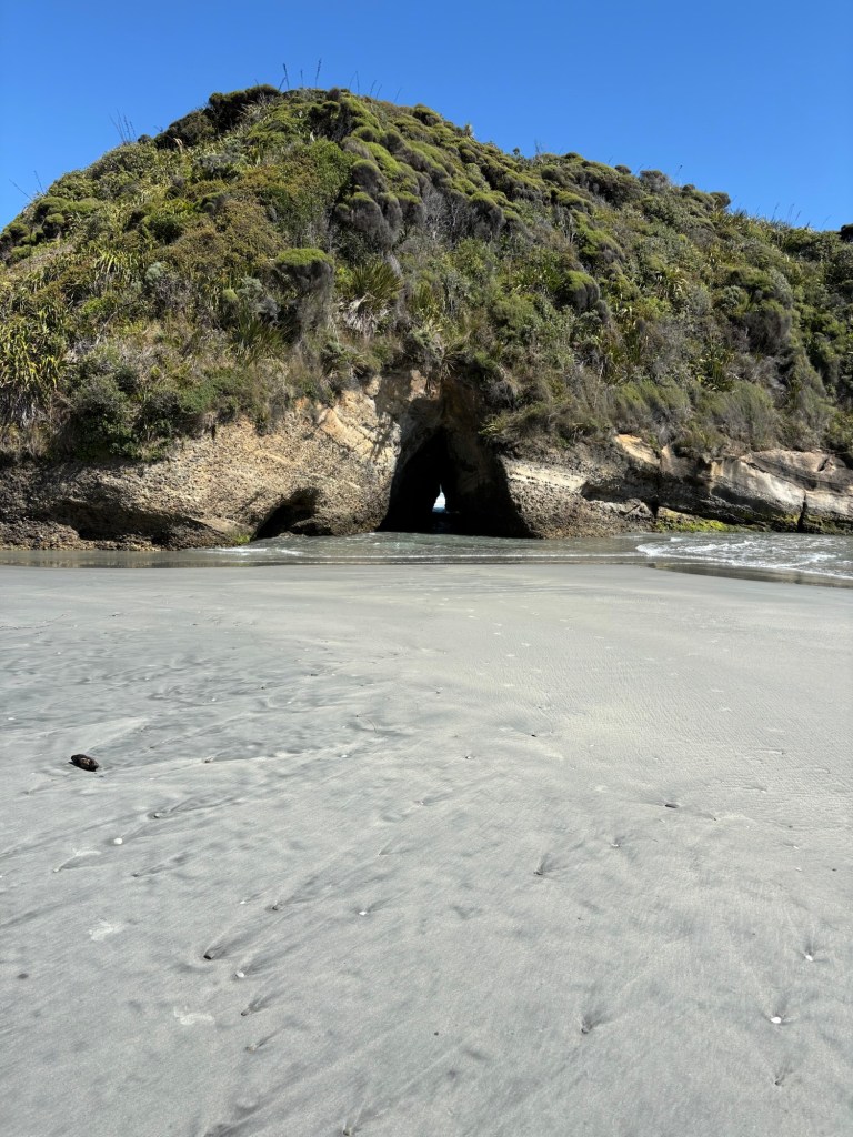 Dann trotzdem noch eine Stunde weiter. Ziemlich genau um 10 Uhr war ich am Wharariki Beach. 20min und 1km hin. Klar in 45 min bin ich zurück.