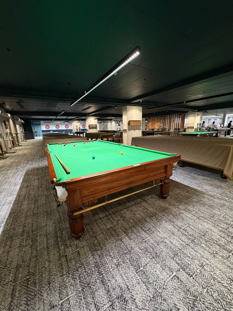 Sechs Snookertische. Nur kein Gegner. Mit der Zeit wurde es etwas nervig. Auf allen Tischen hat es wieder schwarze Klebepunkte auf den Aufsetzmarken. Die Farben liegen immer daneben. Oder zu hoch. Die Kugeln sind alt und dadurch ist die weiße Kugel zu leicht. Das Hauscue ist lackiert und klebt.