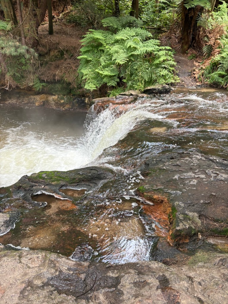 Unterhalb des Wasserfalls bin ich wie alle anderen in den Bach. Den Kopf soll man nicht eintauchen. Es könnte böse Bakterien im Wasser haben. Mir war es zu warm! Und die faulen Eier gibts gratis dazu.