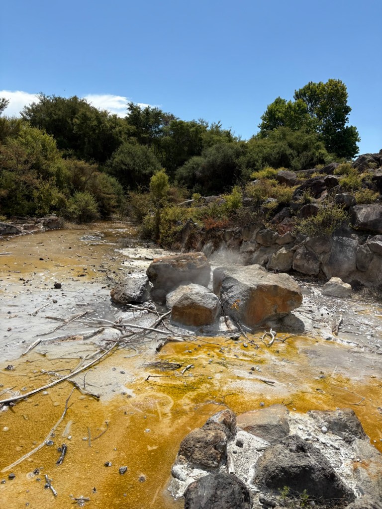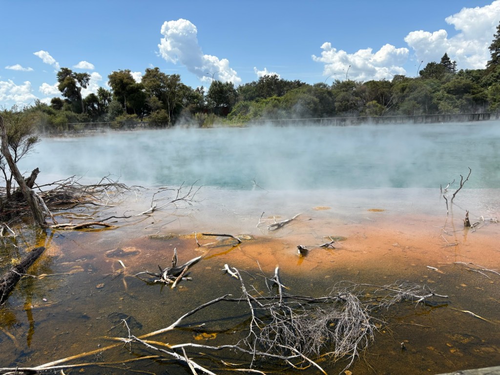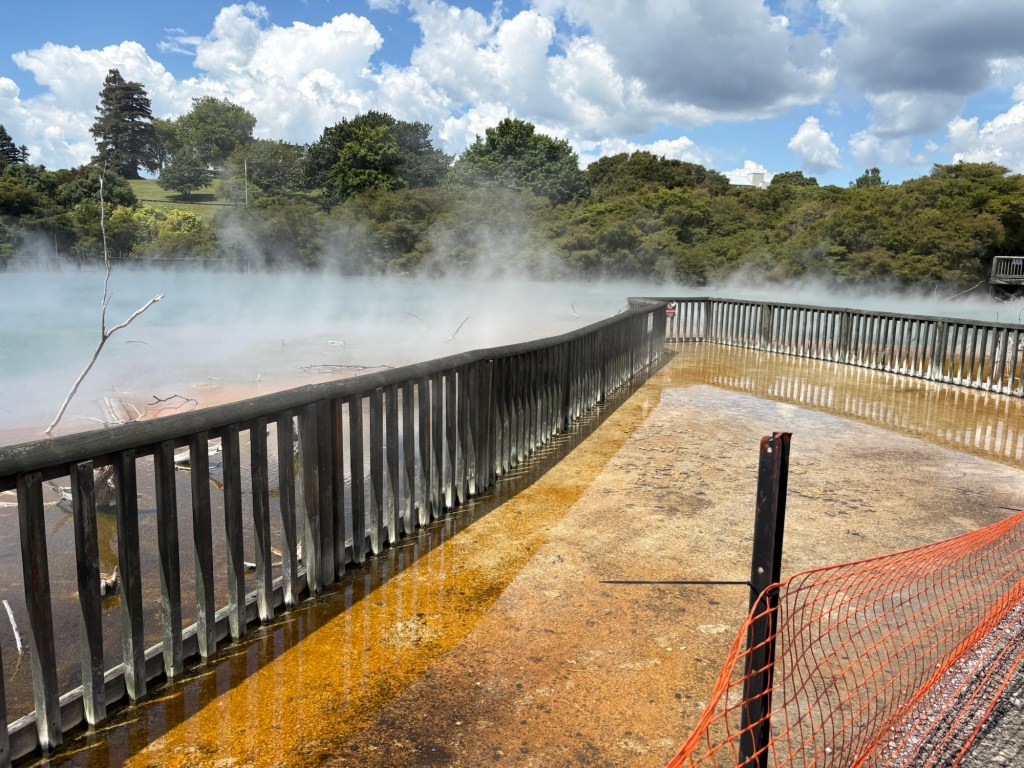 Aber wieso ist der Krater so länglich? Bei seinem Ausbruch 1886 tat sich die 17 km lange Spalte in einer gewaltigen Eruption/Explosion. In den anliegenden Maoridörfern überlebte niemand. Auch die Pink & White Terraces, die als achtes Weltwunder galten wurden zerstört.